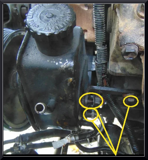 - Remove the mounting screws going from the power steering pump to the engine and bracket.
