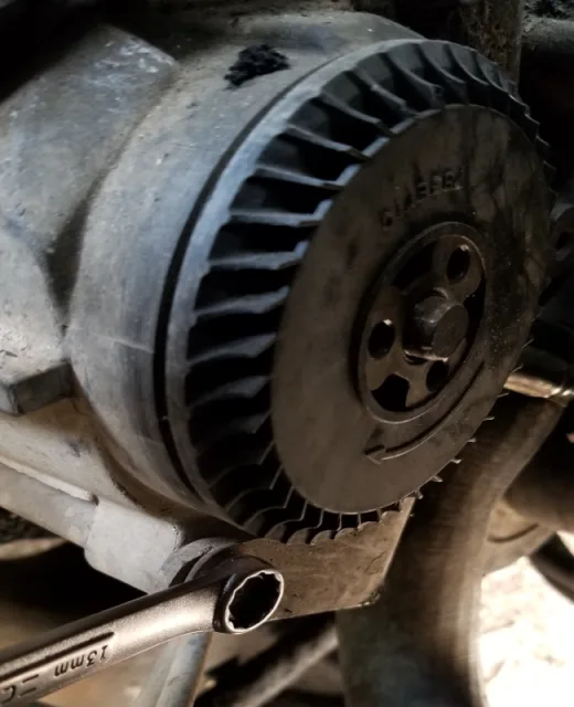 When the engine was turned off, the serpentine belt was ruined, and the secondary air pump pulley could not be turned by any means! It had to be removed and repaired.