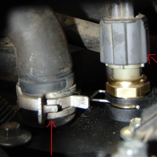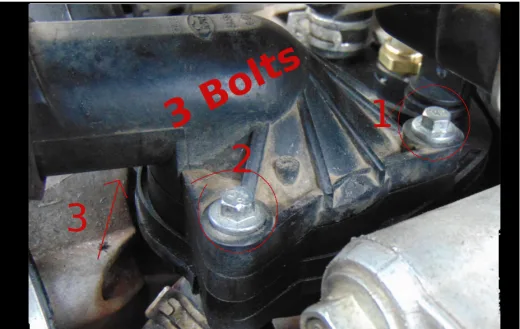 - Take your 5/16″, 8mm, and remove the screws on top of the thermostat housing. Set them somewhere safe so you won’t lose them.