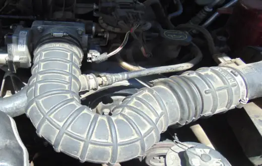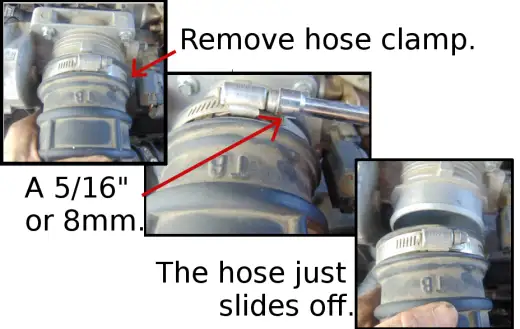 - Using your 5/16″ or 8mm socket, loosen the hose clamp on the air intake and pull the hose off. Bend it back and out of the way, or remove the air filter lid (to which this hose is connected) (un-clip wire connector) and remove it out of the way.