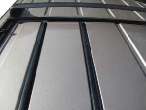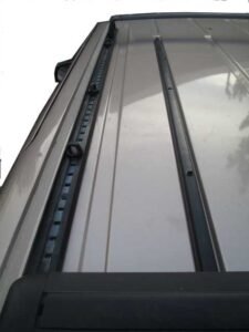Set the base rails back on the roof and attach them with the screws. Use the large head screws on the ends. If the screws don’t go in snugly you may want to tap the hole with a tap the size of your screws first. Be careful not to over-enlarge the holes. Don’t attach the end rails at this point. They will only get in the way of screwing in the end screws (ones with the large stop screw head) and the base rails that go in between the base rails. Hold off until the last step for them.