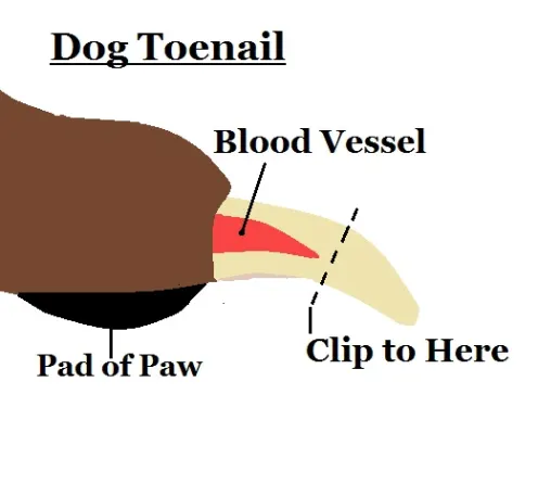Take a look at the photo below, the nail should be trimmed up to, but not into, the blood vessel that runs through the toenail. Dogs that have clear or blond toenails this blood vessel running through it is very easy to see. Dogs with dark brown or even black toenails this is vessel is not visible at all.