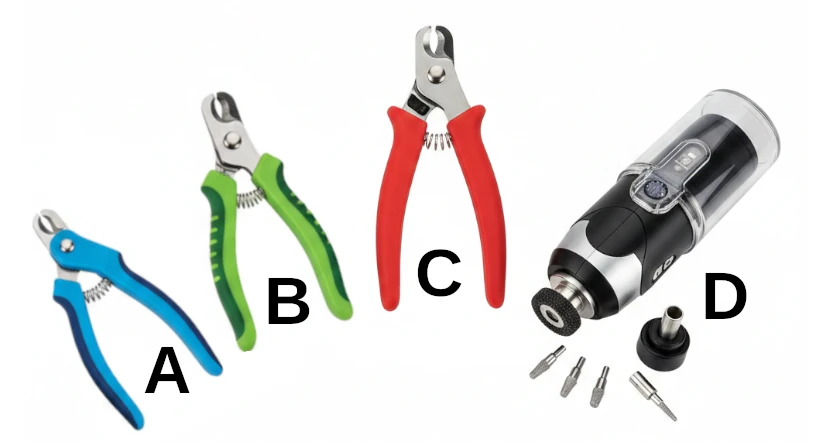 Below are various nail clippers. The first three are you standard nail clipper where A is a light weight version. B is a mid-weight nail clipper and C is a heavy duty nail clipper. D is rotary tool. In my grooming business I use both a mid-weight nail clipper and then I finish the nail with the rotary tool. This way I have a far less chance of clipping the quick. Nip off the end of the nail with the clipper and then use the rotary tool to shorten it up and clean the edges to make it smooth. Be careful because the barrel can become very hot on the nail!
