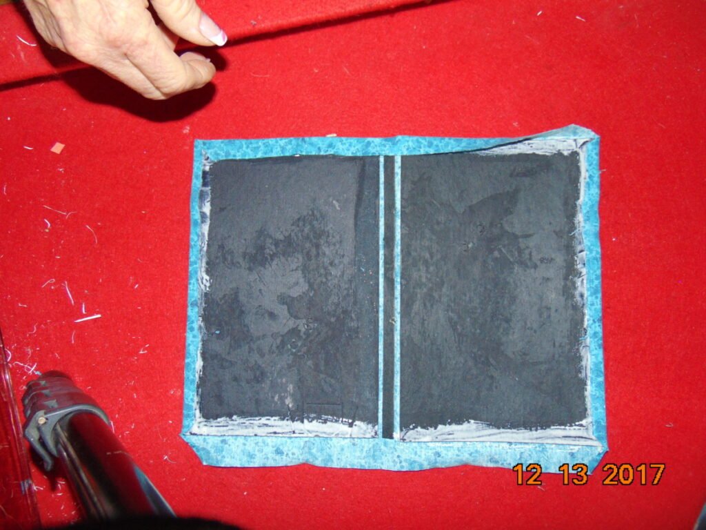 - Lay the book covers and spine down on the cloth you chose. Leave a small space between the covers and the spine (Approx. 1/2″) so it will close properly. Draw an outline on the cloth adding 1″ along the edge. The 1″ overlay will be folded over later to make a nice edge on the book cover.