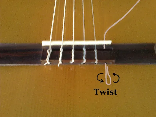 - Once the string is clear of the loop, slide the whole string through the hole or untwist the loop and slide that side through. Either way, slide the string through the hole on the bridge so it is free of the guitar.