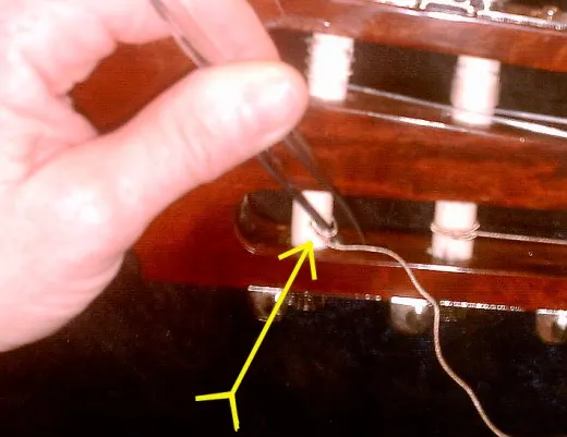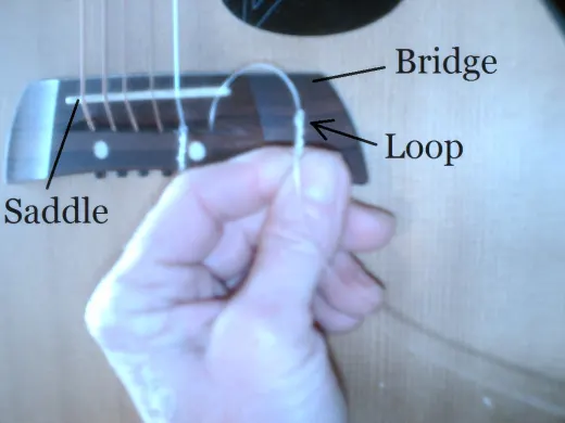 - Lift the loop at the bridge enough to be able to slide the string through it. For the type with a bead: slide the string through with the bead still attached.