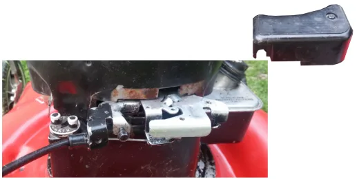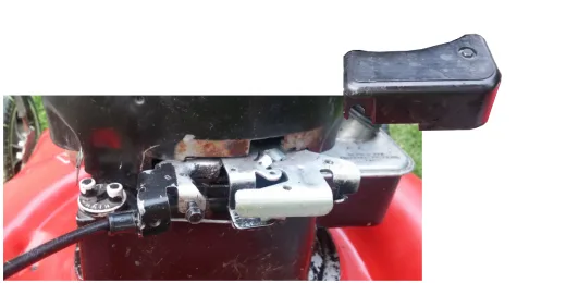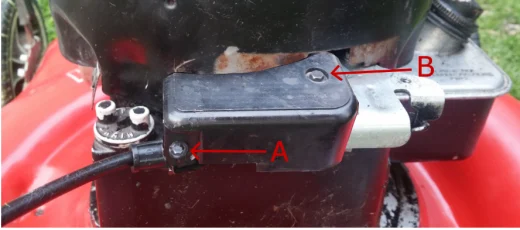The safety switch is usually inside the small box at the back of the mower engine. (see photo series below.) The switch is disengaged when the safety handle at the handlebar is pulled. When the bar is released, the safety switch engages.