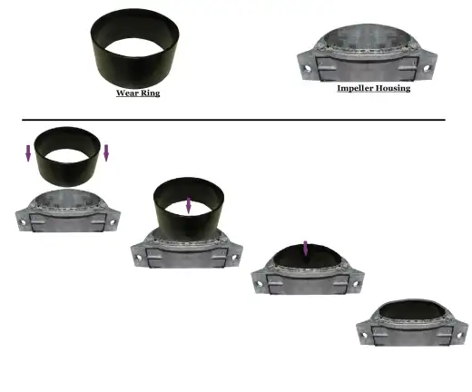 Set the wear ring just inside the lip of the impeller housing. Lay a two-by-four across the top. Press down evenly on the two-by-four to get the ring started into the housing. Then use a hammer to tap on the board. Turn the board a quarter turn and tap again. Turning the board every other tap or so. The wear ring is supposed to be very snug. Once it is seated inside the housing you can put everything back as you took it off paying attention to the torque specifications and grease specifications. The impeller may prove to be difficult to slide back into the housing once the new wear ring is in. If it is really difficult; grease the inside of the wear ring to assist the impeller in sliding in.