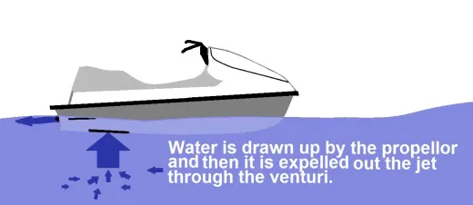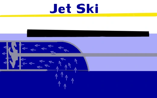 As you can see from the photo above; when the jet ski is running, the impeller draws water up from the surrounding water underneath. The water then passes through the impeller and expelled out the back through the venturi. The nozzle on the end, attached to the venturi, directs the water stream. The nozzle is controlled by the rider via a cable attached to the handlebars and the nozzle. This is the flow of propulsion.