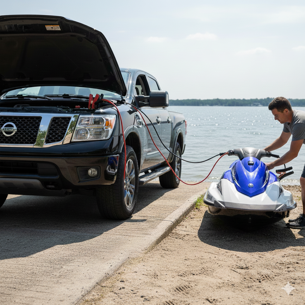 If you’re in a position where you can’t get a vehicle near the jet ski and you don’t have a portable battery booster, you can bring the battery to the jet ski. Set the auxillary battery near the jet ski.